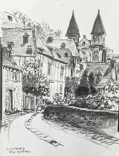 身辺整理は精神的にくたびれる作業だ。捨てる決断をするにも いろいろな思いが籠っていて時間もかかるからだ。救いは思いがけない発掘があること。見付けたのは20年以上前のスケッチでのコピーで、巡礼路上にあるコンクのサントフォア修道院教会堂。着色した筈だが本物の行方が分からない。11・2世紀に建てられたロマネスク様式の会堂。結構光線の強い日だったと思う。ファッサードに向かうこの巡礼路に帆布の椅子を拡げ短い時間で描き上げたことを思い出した。躊躇い線を感じない。(2025-4-14載)