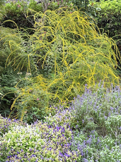 8月17日のこのHPで、庭にこの木の枝が大きく繁って来ていることを報告したが、涼しくなった今 たくさんの花を付けている。よく見ると まだ小さい蕾も沢山ついているので 更にこんもりと黄色づくのではないかと思う。ただ この勢いを見ると 放って置くと一面に繁茂しそうなので、花が一段落ついたら、思い切って切り詰めるつもり。本当に 打ち上げ花火の「黄色い枝垂れ柳」のよう。(2025-10-5載)
