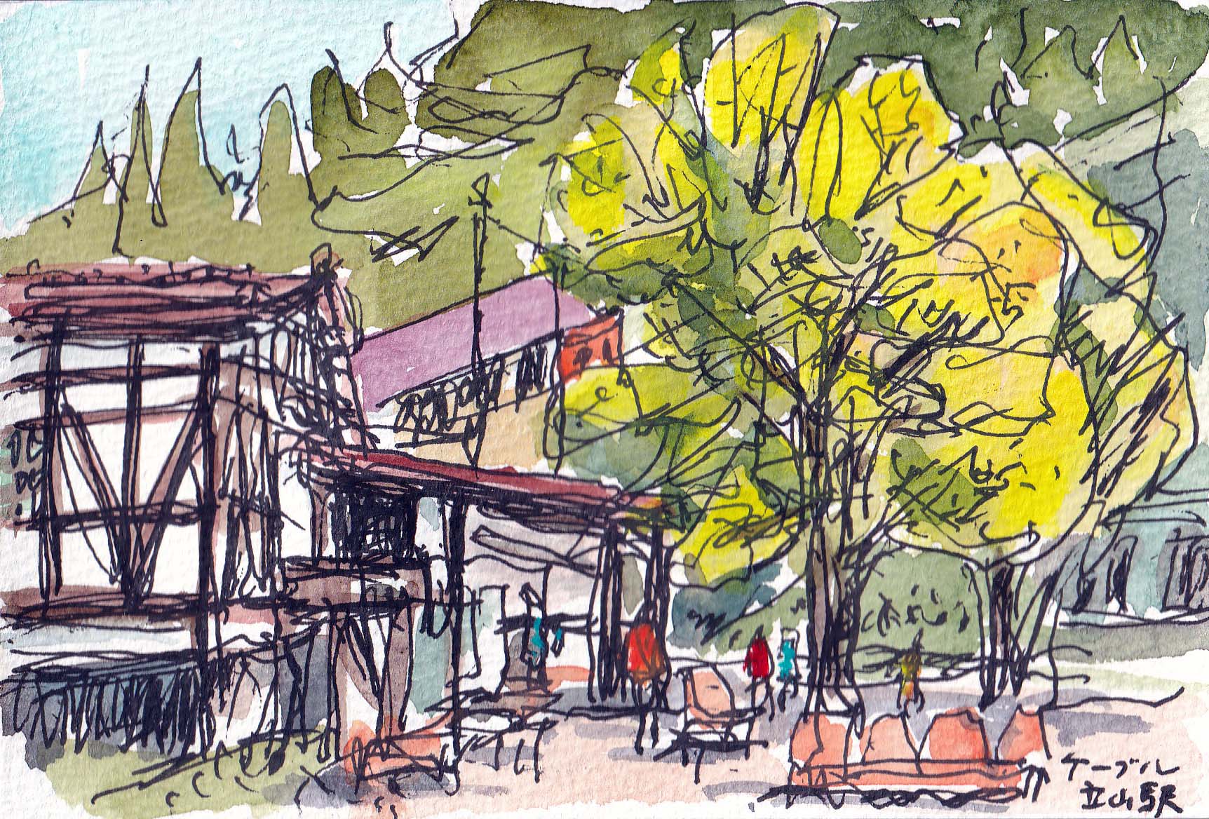 「宇奈月・立山・黒部」を巡るツァーに参加してきました。私の年齢では かなりキツイ旅でしたが、粗いスケッチを何枚か残すことが出来ました。 これは立山黒部アルペンルートの中の、ケーブルカー「立山駅」。乗車迄のほんのわずかな時間での走り描きです。ここから7分ほど乗って「美女平駅」まで高低差500メートルを稼ぎます。この辺りから紅黄葉が始まっていました。ツァー初日とは打って変わったような 晴天でした。(2025-10-20載)