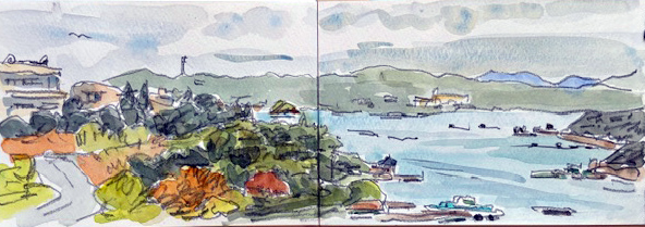 今回の旅 時間的余裕がたっぷりありましたので、手持ち在庫の用紙をいろいろと持参してみました。それに応じて描く鉛筆やペンも。 初めてホテルの部屋に入って、窓から眺めた第一作。久しぶりに鉛筆を使ってみました。ペンに較べて柔らかいが ややメリハリに欠ける絵です。昔見た写真では 湾内にもっとたくさんの真珠養殖の筏があったことを思い出しました。(2025-11-10載)
