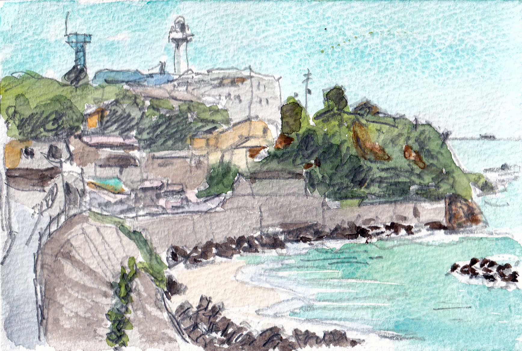灯台の麓から西へ海岸沿いに歩く。「宝門の浜」と書いて「ホモノサカ」と読む。その先の「船頭の祠」まで行って 振り返った図。今は干潮時で潮は引き気味。左手にコンクリートの壁が続くが、「風よけ」のために建てられたそう。(2025-11-13載)