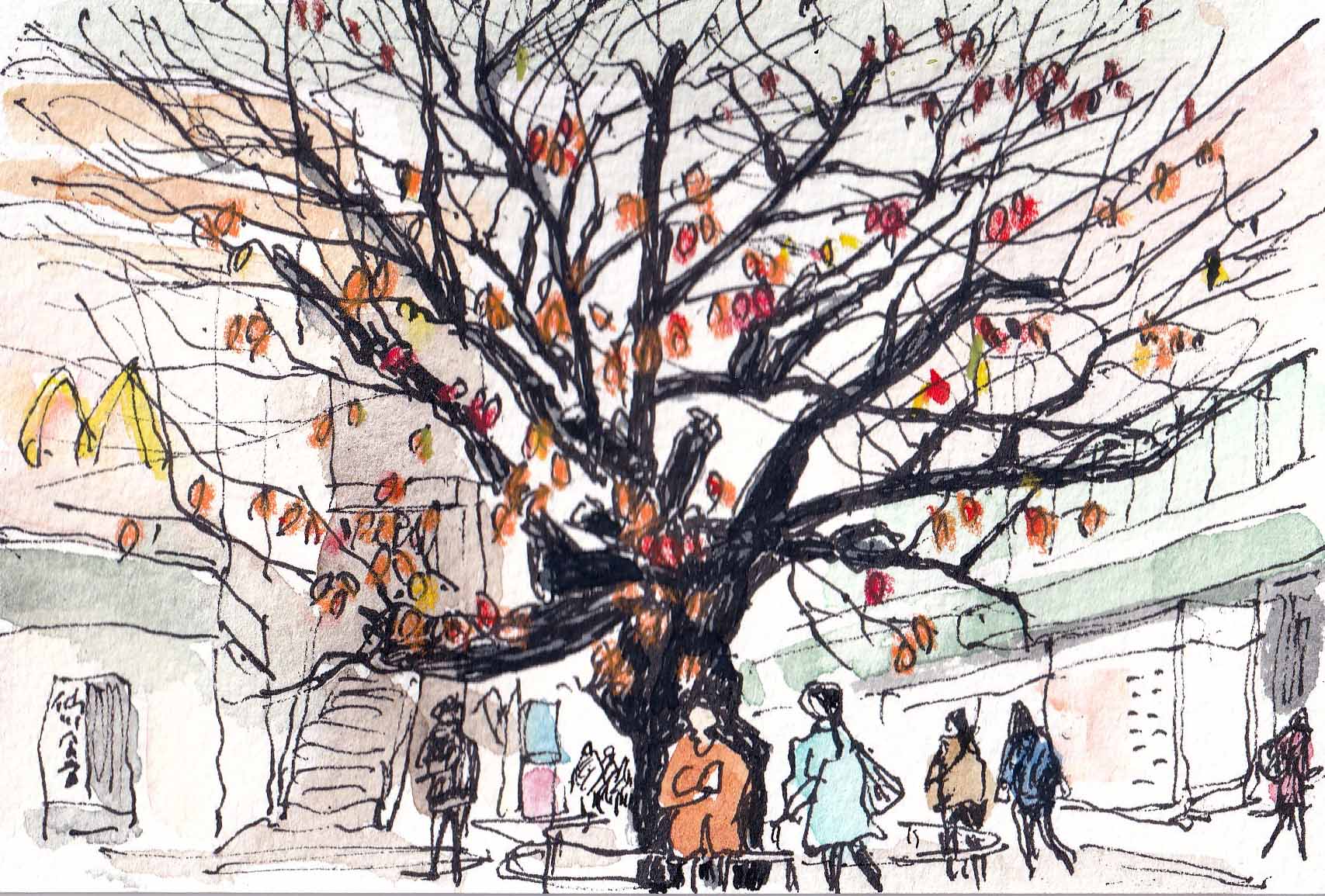 仙川に出掛けた。駅前の桜に最後の桜紅葉がしがみついていた。花が咲いている時は大きく見える桜も裸になると、力強さは無い。そもそも駅前整備の時にこの桜は取り払われる予定だった。そしてバスがここまで入って来て利便性が増す予定だった。ソメイヨシノの寿命が短いことも考えない感傷的な市民運動に押されて、結局 桜はこの位置で残ることになった。柵はしてあるが、かなり周囲迄人の足は入っていて土は固い。果たしてこれで良かったのであろうか?(2025-12-10載)