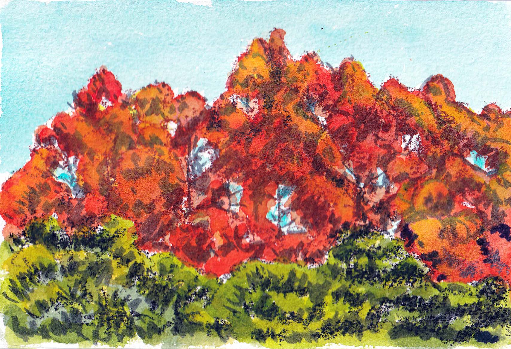 私が求めて来た絵は、「水彩画」ではなく、「スケッチ淡彩画」である。後者は筆記具で対象物のデッサンをし、それに薄く水彩絵の具で着色するもの。これまで沢山の画材を買い求めて来た。筆記具各種(鉛筆各種からコンテ、水性顔料ペン、フェルトペンや筆に近い物など)、水彩画用紙(世界最高級と言われるアルシュをはじめ ファブリアーノ、ウオーターフォード、ワトソン、ケント紙他)。買い求めたけれど、自分との相性は価格・世評とは一致しなかった。従って未使用在庫は沢山ある。 神代植物公園で鮮やかなメタセコイアの紅葉を見た。最盛期は過ぎていたが、これに在庫の画材で挑戦してみようと思った。アルシュなら良い色が出るかもしれないと考え、最初は鉛筆で始めたが気に入らず、ダーマトグラフ、サインペンを追加的に用いて重ね、最後はやや筆状の顔料ペンを重ねた。しかし、どの段階でも満足いく出来栄えにはならなかった。今描いているのはいずれもハガキサイズ。この小さな画面というのも、一つの制約になる。今から残された時間で使いこなしは難しいだろうが、挑戦してみようと思う。(2025-12-12載)