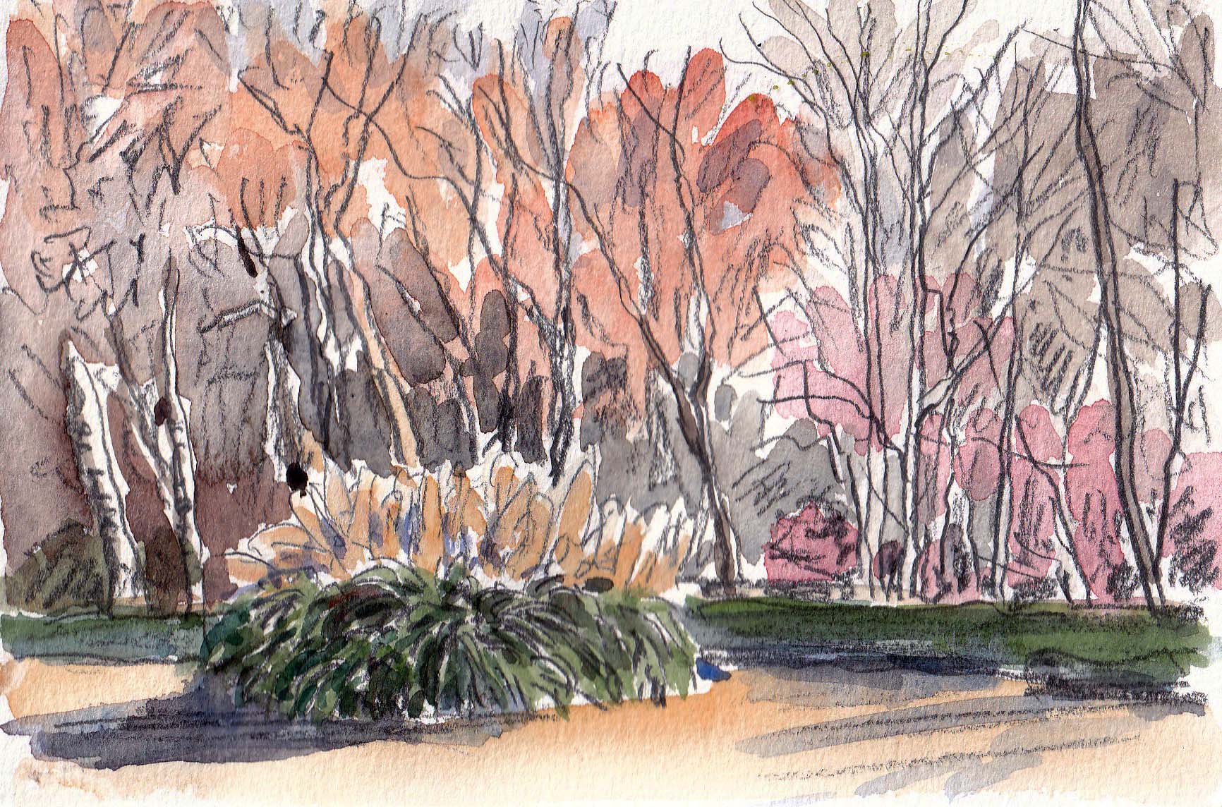 神代植物公園には芝生広場があり、中心にパンパスグラスの大きな株が、少し外れて小さな株がある。それをメインに背後に雑木林を入れてみた。使いやすい画材の再発掘が狙いだったが、それも画面の大きさによって左右されることを早くも確認、ハガキサイズの限界を知った。雑木林にしても細かいところまで、つい線描したくなったが、程よい程度で止めるべきことも学ぶ(用紙:モンバルキャンソン)。 ところでこのパンパスグラスは、繁殖力旺盛なため「庭に植えるな」と園芸書には出ている。ゴルフコースの中にこの株が散在する所でプレーしたことがあった。この中に打ち込めば、「アンプレアブル」万事休す。(2025-12-13載)