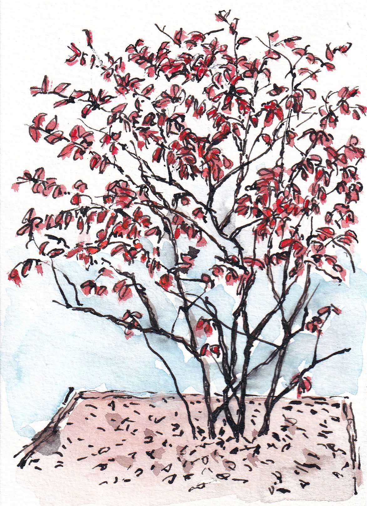 近所の放置されたような草地に、2年位前から手が入り、ブルーベリーが植えられるようになった。この木 成長がはやく秋には沢山の実がなるようになった。その後の紅葉は今が盛り。特に日の光を受けるといっそう美しい。(2025-12-20載)