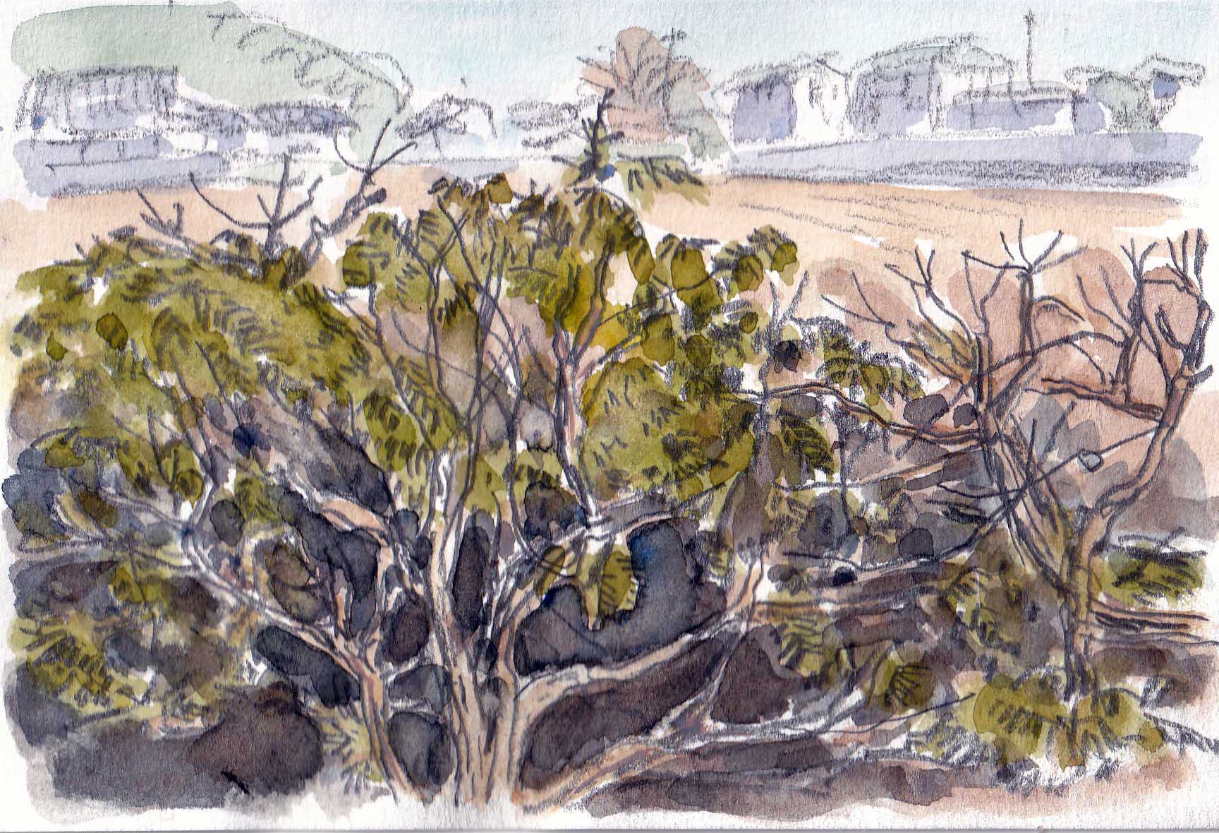 耕作するつもりはないらしい。間もなく宅地として売り出されるのだろう。境界線のヒバの垣根は伸び放題で、枯れかかっているようだ。この絵 枝の合間を黒く塗り過ぎてしまった。透けて地面も見えるのが正解。ところでかつて見たが、枯れたヒバは白骨化したようで変わった造形であった。(2025-12-21載)