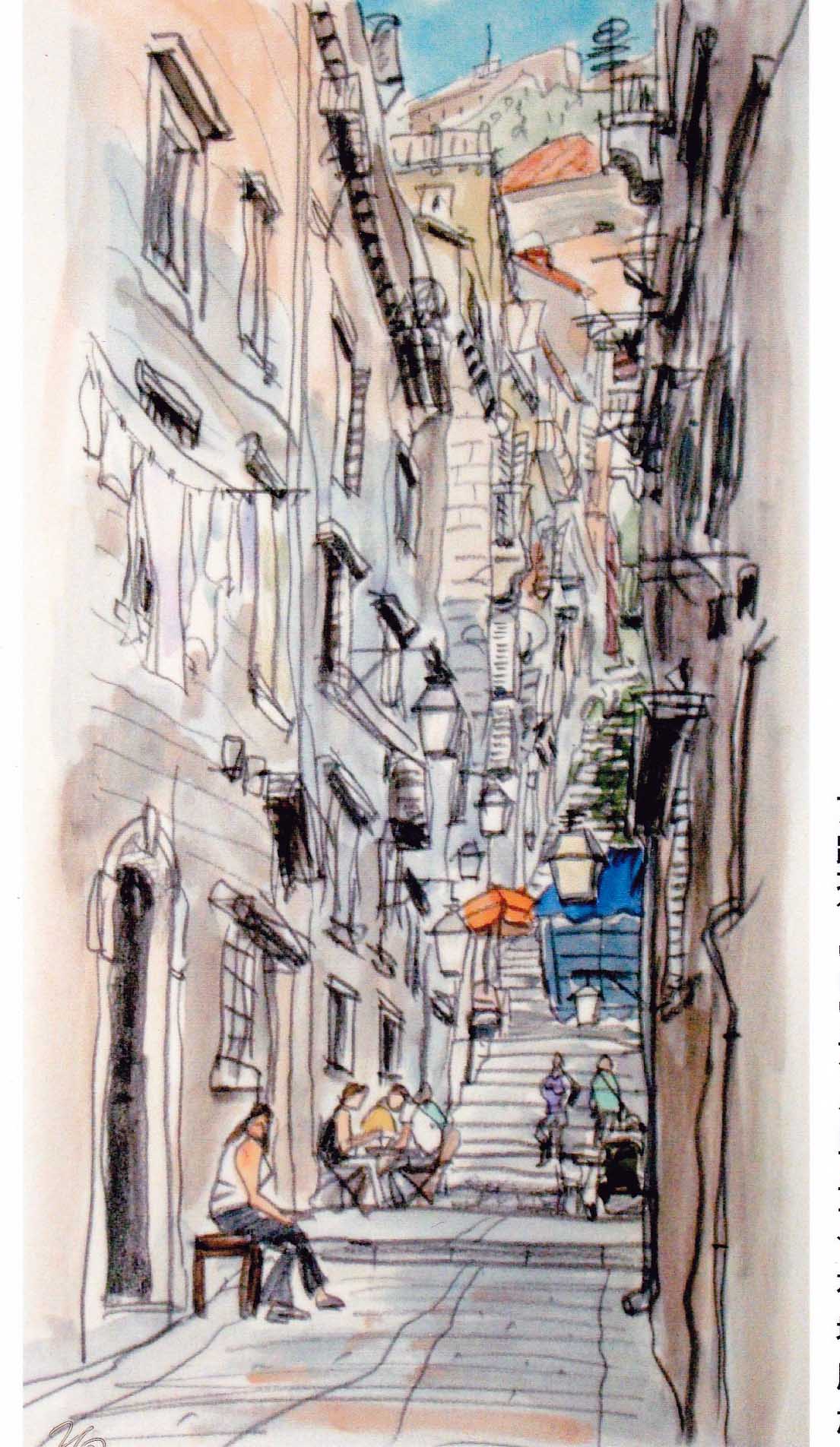2006年 クロアチアへの旅。ドヴロヴニクの街はいたる所絵になる。観光客の多く行き交う中心の通りから、山側へ向かって脇にそれるとこの絵のような生活道路がある。と同時にレストランも多く在る。この坂道をスケッチしている間 坂の登り口に女が座って 時々こちらを見ていた。小一時間で 描き終え画材を仕舞い始めると、その女がこちらに向かってやって来て、自分が描かれているのを確認すると大変満足した。この女 向かいのBARの店員。客の少ない時間帯は こうやって人の流れを眺めていたのであった。(2025-12-22載)