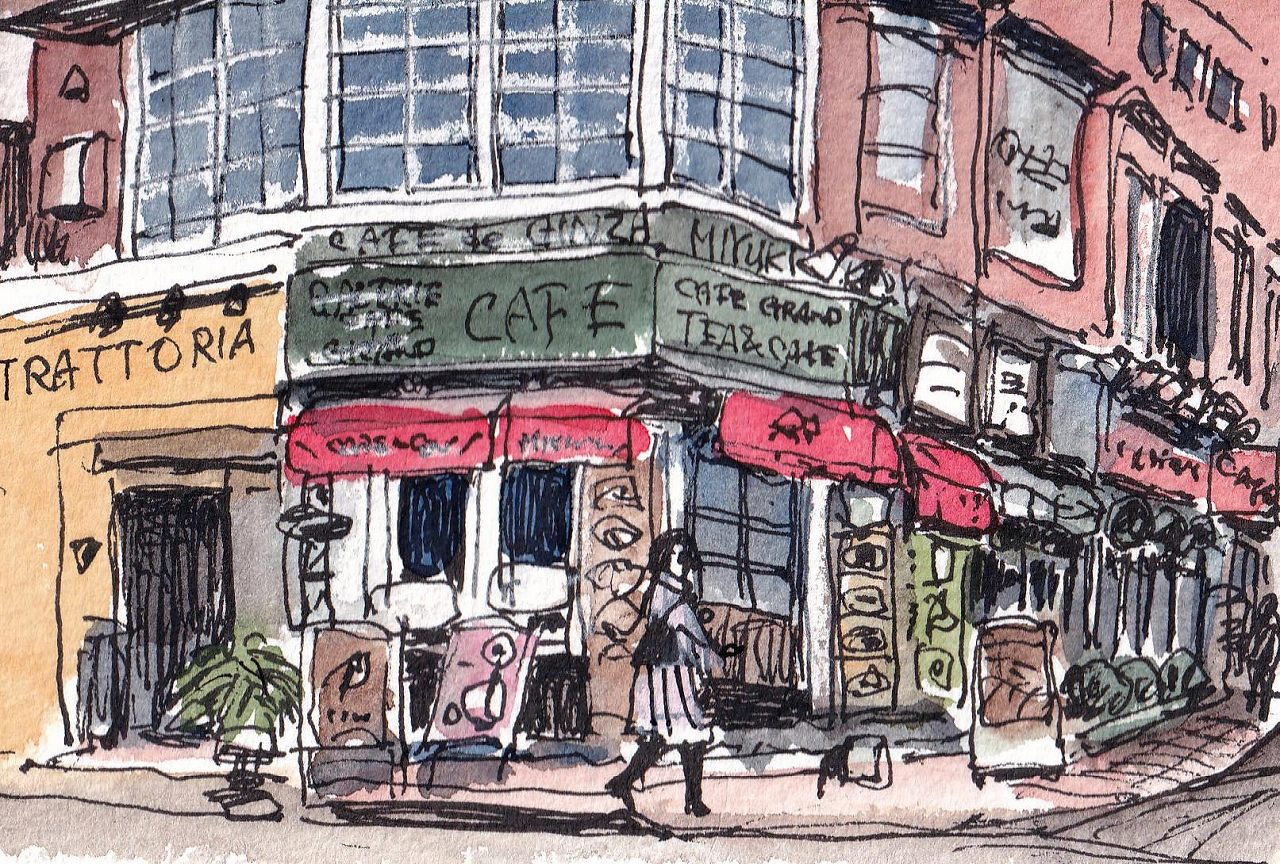 歌舞伎座の斜め向かい、昔の町名で言えば「三原橋」の辺りに、パリの裏町にあるようなビストロを見かけました。これもチャッチャ描き。2枚と言わずに1枚に集中して、より大きな紙に描けばまともな作品が出来るのでしょうが、この辺りでは そんな行動は取り難い感じでした。(2026-1-6載)