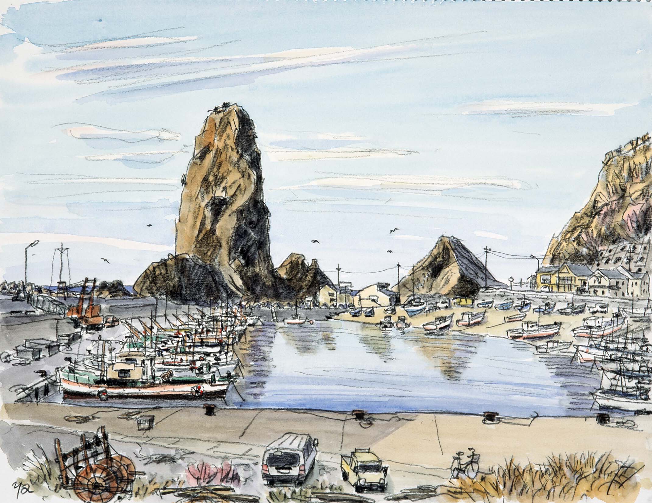これは勝木(がつぎ)にある「寝屋漁港」をスケッチしたもの。宿で この絵を見た女将は言った「花城さん、あの尖った岩と右側の山はかつて一つの山だったのよ。それが‘この前の地震’で、真ん中が崩落して 今の形になったの」と。なるほど山側には崩れ落ちたあとをコンクリート擁壁で覆った痕跡もあった。 今回ここに載せるに当たってネットで「この前の地震」を調べてみた。なるほどこの地方は過去に大地震を幾つも経験していた。しかし、この山崩れを説明するようなものは見つからなかった。それよりも岩には「鉾立岩(高さ51m)」という名があり、国の天然記念物にも指定されていることも知った。「この前の地震」が最近起こったものとは考えられなかった。女将の認識間違いか、私の聞き違いか?(2026-1-8載)