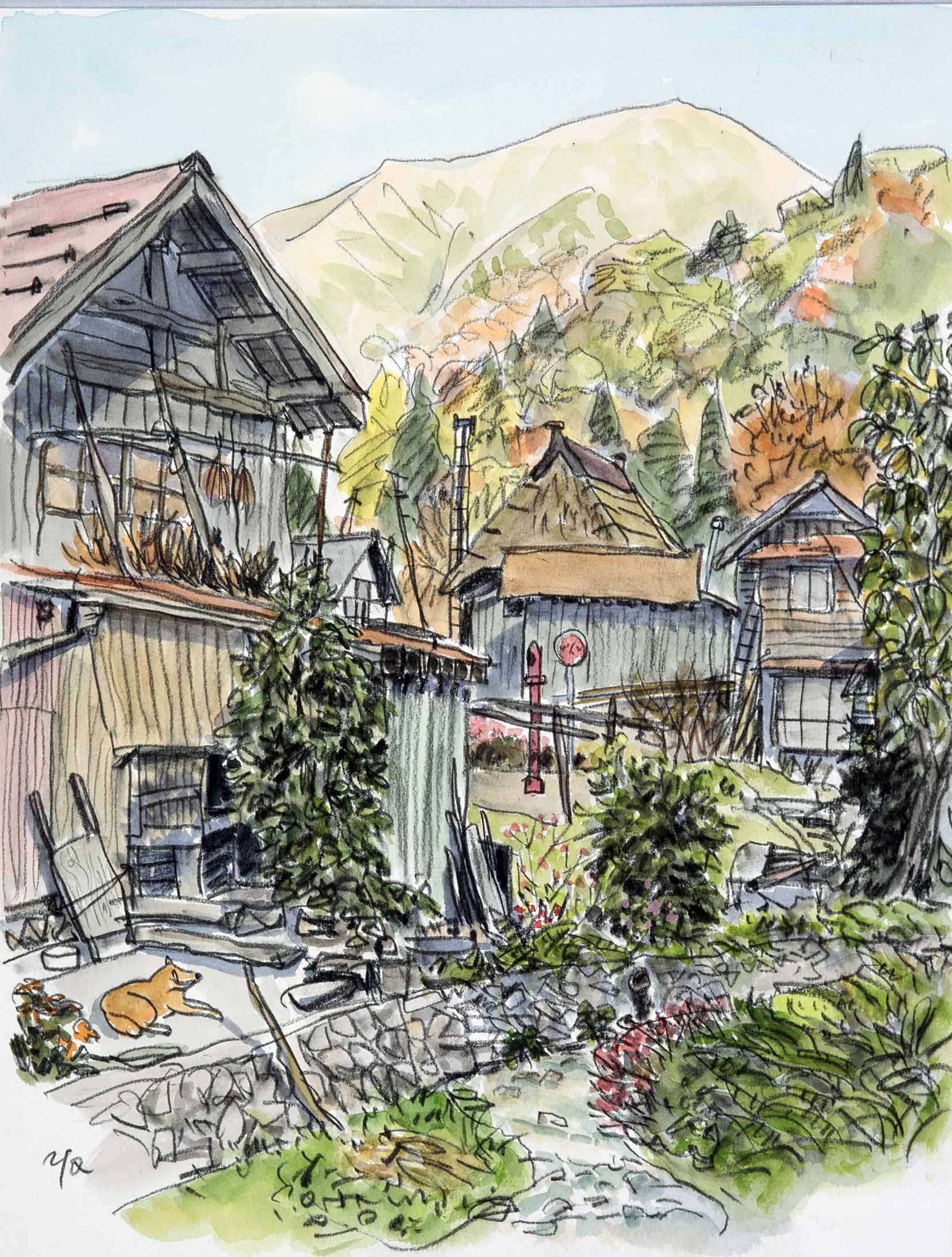 海岸の「笹川流れ」だけではなく、山の奥地にも関心を持った。府屋の集落から入ってみる。途中 山形県境の標高555M「日本国」という大それた名の山裾を通る。そこには同じ名の地酒もあり、ひと気も無い所に大きな広告版が立っていた。やがて雷という名の集落に到達する。集落の入り口では老人数名が集まり、幟を立てていた。民家の軒先で犬が昼寝をしている姿をスケッチする。すると何処で見ていたか、老婦人が「今日は集落のお祭りなので」とおはぎを持って来てくれた。何枚か描いて山を下ることにすると、先ほどの幟を 今度は下ろしている作業に出会った。尋ねると「先ほど一人の老人が亡くなった。今日の祭りは中止だ」と。先の老婦人と言い、人々の温かい繋がりを感じさせる村だった。あれから約20年、高齢化・過疎化はさらに進んでいることだろう。現在は村上市になっているが、真冬には3Mもの積雪があるという。(2026-1-9載)