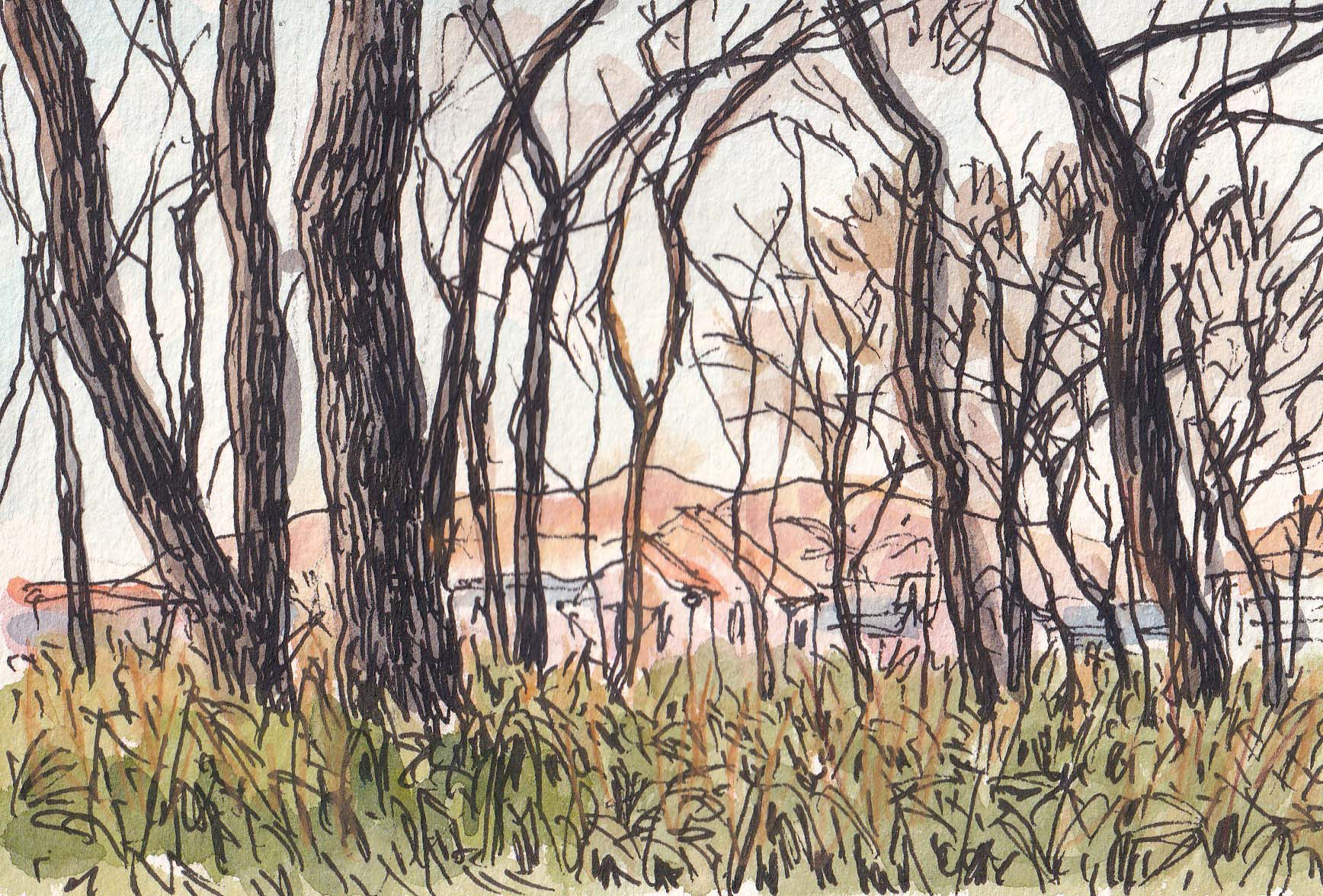 HPに載せるものが無い時は 近くの雑木林に行く。その時々で風景も変わるが、画材を変えてトライしてみる。今回はサインペン使用。同じような景色を先だって載せたが、その時は鉛筆画。家内は言う「鉛筆画の方がずっと味がある」と。確かにそういう時もあるが、描くのに使える時間・紙質などで一概にはそう言えない。ただし ハガキのような小さな画面ではなく、大きな画面に描くときには、間違いなく鉛筆の方が良い。(2026-1-14載)