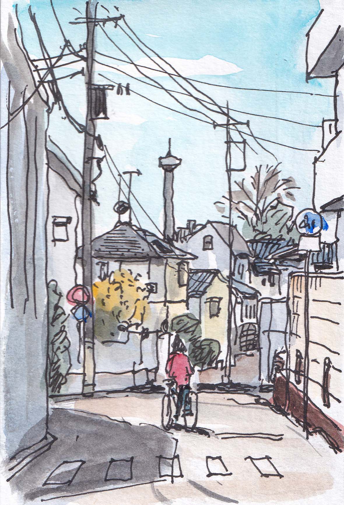 近くでも改めて見回すと 意外と面白いものに出会う。この絵の場合は、緩やかな下り坂と高く聳える給水塔がそれ。最近 水道の水圧が上がっているのか それぞれの建物が屋上にタンクを保持しているのか、 新しい住宅街やマンション群に 給水塔をあまり見かけなくなった。近くの「多摩川住宅」や「緑が丘団地」へ行ってみると 給水塔は最早働いておらず 遺物として残り 一部は撤去もされている模様。 ところで電線は描いた方が良いか 省いた方が良いか。初めの頃はは省略していたが 最近は本数を減らした電線は「生活感」を演出すると思って入れることにしている。途中をたるませ 一気に描く電線が 必ずしも目的の位置に辿り着かないことがままある。かと言って慎重にゆっくりとペン先を運んだ電線がブルブルとして見苦しいことも多い。いずれも訓練不足が原因。(2026-1-16載)