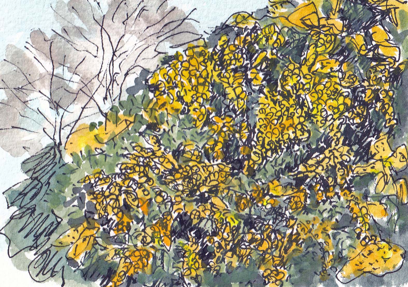 オカリナ教室を終えて外に出た瞬間、仲間の女性が声を上げた。 「アレ!? あそこにあるあの黄色いかたまり何? あんなの在ったっけ?」 「あれはミモザですよ。一気にいっせいに咲くけれど花の命も短い。終わった後は茶色くなって見苦しいけれど」と解説。本当にある日突然 黄色い姿を現すのだ。 初めてだけれどスケッチしてみた。あの小さい花をどう描けば良いか? 初めは細かく描いていたが 途中からしびれを切らした。だんだん大雑把になって行く。本当はもっと遠くから捉えれば良かったみたい。この花 アカシアの一種であることを今回初めて知った。(2026-3-3載)