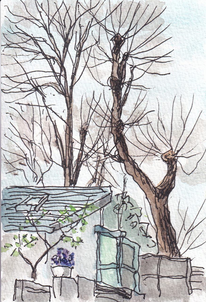 前掲の「黄色い家」から約50M先へ進んだ所で描きましたが、ちょっと変わった家を入れようとしたため、構図的に無理があったと反省です。もっと樹々の梢に的を絞って捉えれば良かったと思います。近々また挑戦。(2026-3-9載)