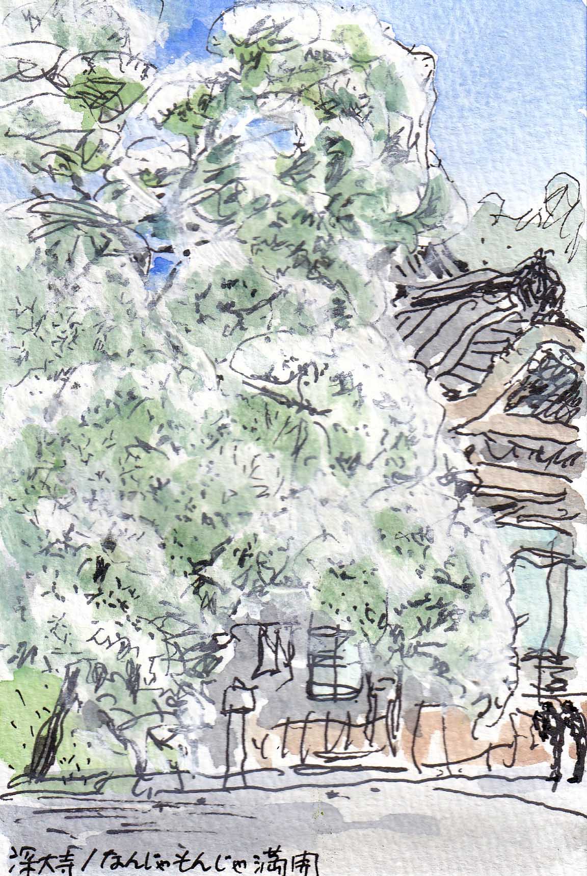 昨日 妻が深大寺の「なんじゃもんじゃ」の花満開を見て来たという。「4月28日にこの木の下で東京消防庁音楽隊によるコンサートが予定されているけれど、ちょっと盛りを過ぎるわね」という。温暖化の下では、開花予想は何の花でも難しい。それでは時季遅れにならない内にと、出掛けてみた。 部分を描けば それらしくなりそうだが、モンスターのように大きくこんもりした姿を捉えてみたいと思った。(2026-4-22載)