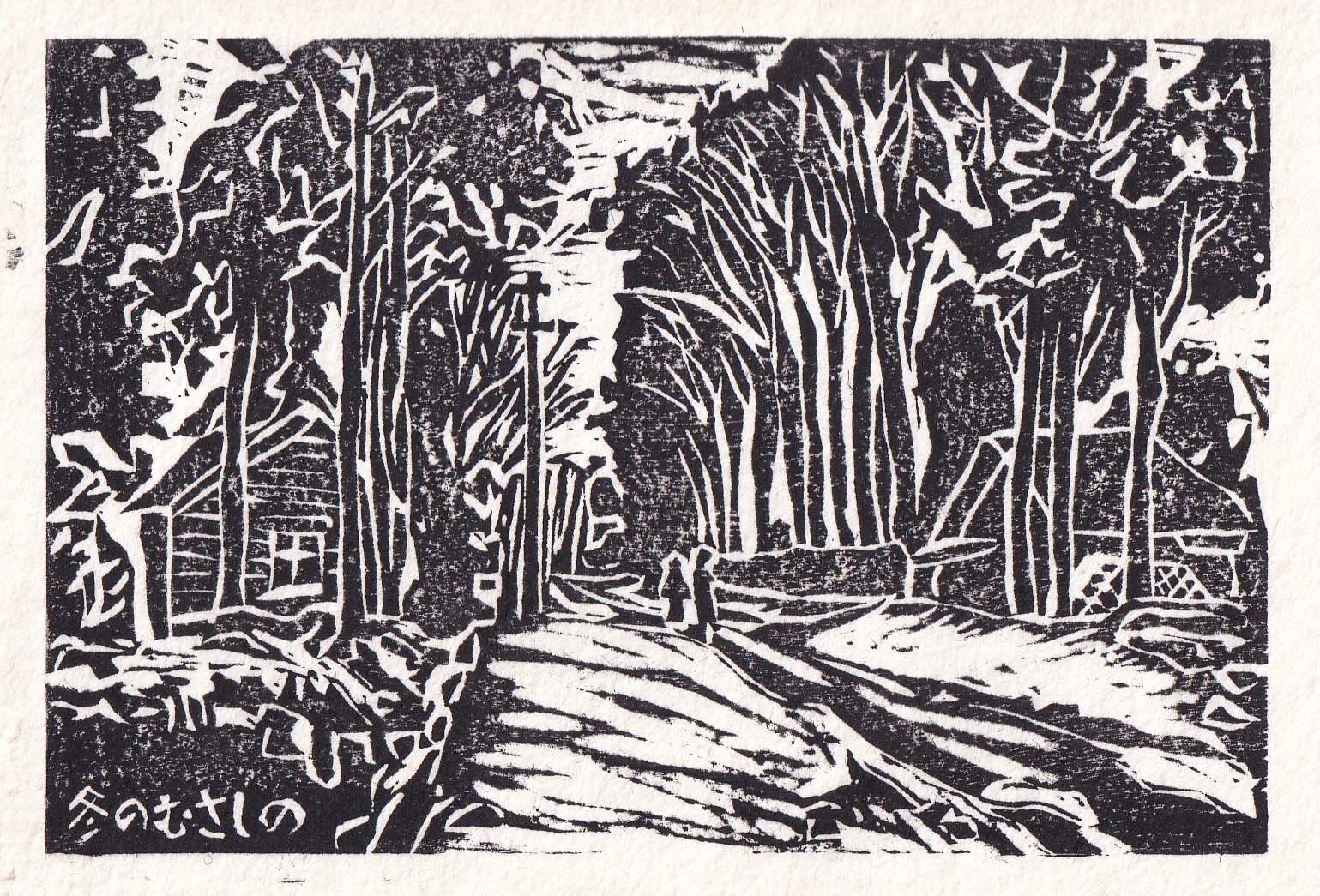 私たち夫婦は昭和39年に結婚しました。その翌年の年賀状に使ったのがこの版画、昭和30年代の雪の武蔵野です。当時小平辺りまで行くと、まだケヤキ並木の続く細い街道がたくさん残っていました。大雪が降ると除雪が間に合わず道路両脇に高く積まれていたものです。この版画の左脇には「賀正 1965」と刻んでありましたが、その後削り取り、絵の面だけ独立させたものです。(2022-1-3載) なおこのホームページのトップ画面、まず「松」が出ますが、7秒ほど待つと「竹」を描いた鎌倉旧街道が出て来ます。さらに暫くすると紅白の「梅」が出る仕組みになっていますのでご笑覧ください。