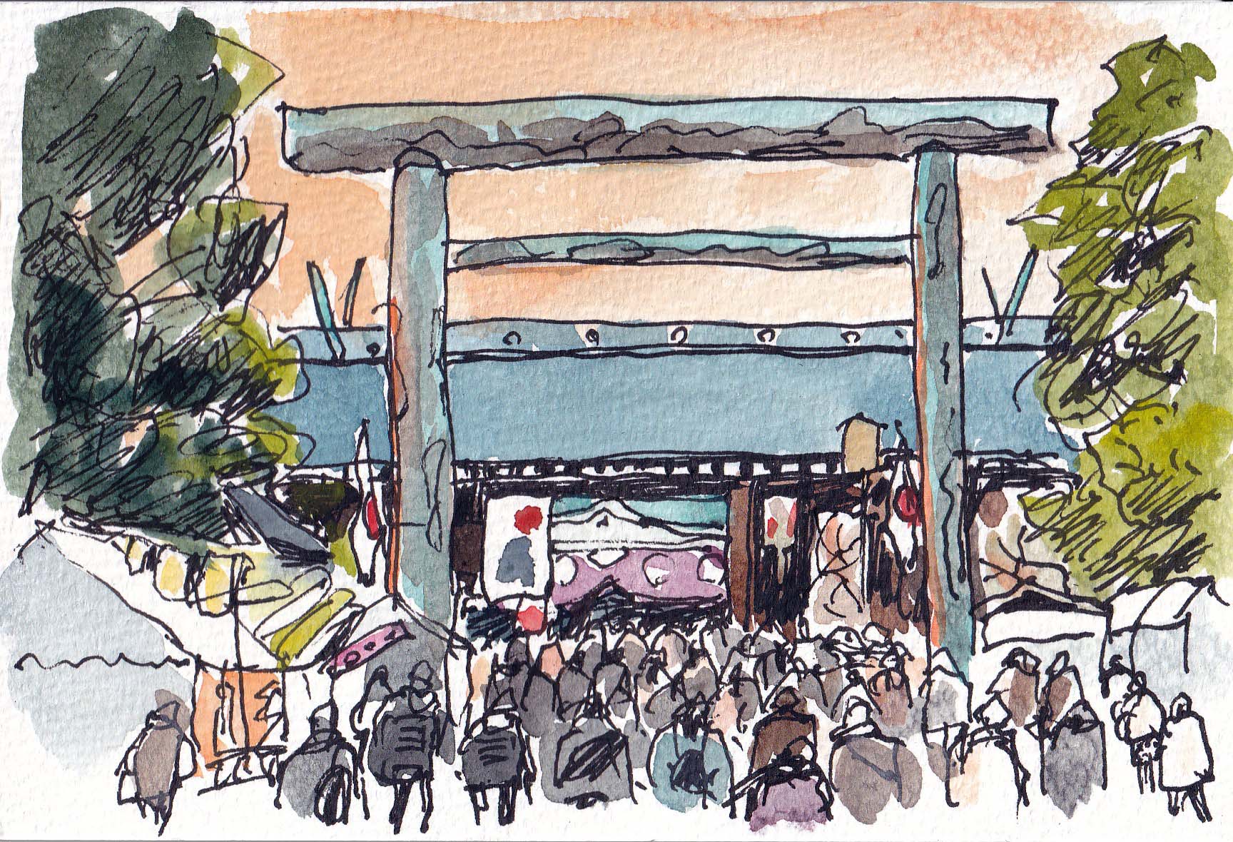 お賽銭を払うことも出来ないので、次に靖国神社をお参りすることにしました。こちらはかなりの人出。振り袖姿の若い女性も居てお正月気分です。拝殿に向かって行列がありましたので当然のこととしてその後尾につくことに。しかし30分近く経っても僅かしか進まず。この間周囲を観察すると、40歳代後半以上の人は全く居ません。80歳代なんか問題外で、居るのは若い人ばかり。そこで行列を抜け出て脇道を通り遠くから本殿を遥拝し、破魔矢を求めるだけにとどまりました。ラッキーなことに「献上酒お試し所」があり、旨い酒が飲めたのでお賽銭相当額を置いてきました。(2022-1-3載)