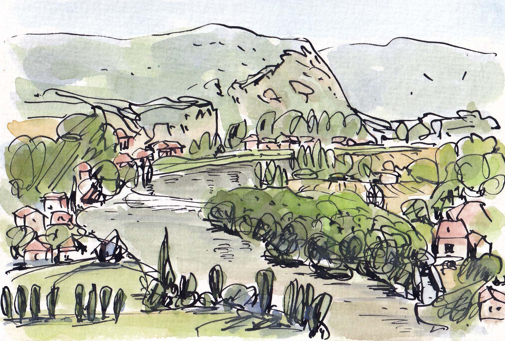 暮れの整理で面白いものを掘り出して、自分でも「何故?」と考え込みました。ハガキ版スケッチ2枚で、いずれも大きなF6でスケッチをした後、集合までの時間調整に早や描きしたもの。こちらの1枚は、フランス南西部にあるサン・シル・ラポピーの観光名所(100Mの岸壁に建つ教会が主役、これをF6に描きました)を背にして岸壁の下のロット川を捉えたもの。現地で彩色するまでの余裕がありました。この街は人口約200名で、「ヨーロッパの美しい村30選」にも入っているようです。(2022-1-9載)