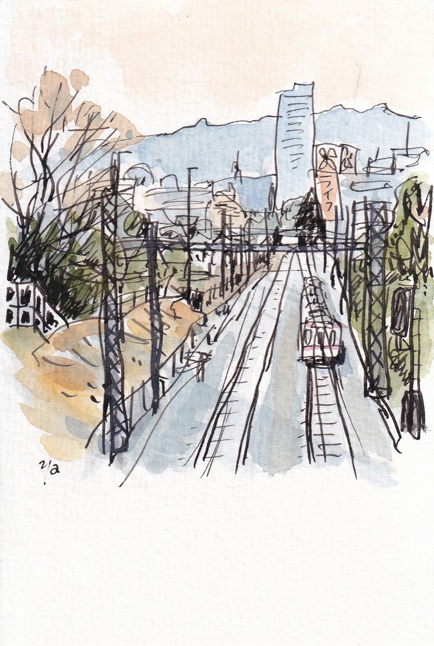 先の絵を描いてから間もなく高圧線は撤去されました。あれだけ高い鉄塔を撤去するのですから、作業の途中で私も気づく筈でしたが全く分かりませんでした。不覚でした。この絵は葉書サイズですが、前の絵から10年以上経って描いたものです。正面に見えるのが「国領タワー」、2004年に完成し高さは118M、当時は多摩で一番高いと言われていました。最上階は北島三郎が全フロア所有し住んで居るとも言われていました(今は分かりません)。左の木の生えている所は、戦時中高射砲陣地だったとかで、つい2年前まではまだコンクリートの土台が残って居ました。(2022-1-11載 2と1が3文字づつのお目出度い日です)