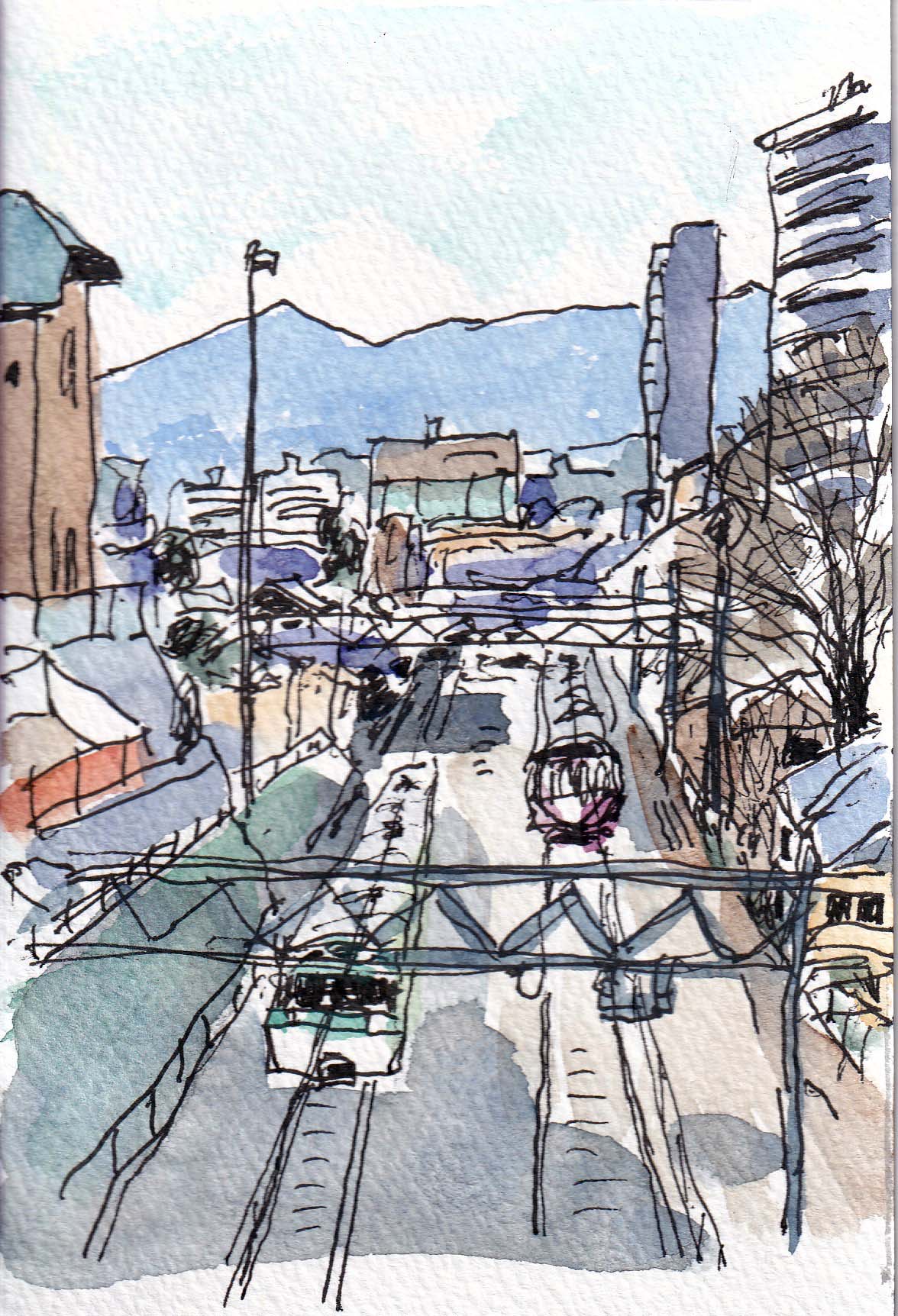 昨日載せた絵では線路の正面に「国領タワー」がありましたが、現在同じ位置で確認してみるとこの絵のようにもっと右側にありました。別に建物が移動したわけではありません。写真と違って絵は印象で描いていますから自分の中で移動は勝手です。正面にはむしろゴルフ練習場の緑のネットなどが見えます。また「つつじが丘」の駅も跨線橋方式になり立体化しました。右手にあったスーパーの「ライフ」は1キロほど西に移転。耐震強度が不足だったのか6階建てのビルは解体され、新たに20階近くあるマンションに建て替わりました。高射砲陣地跡も宅地化が進み、今もネットを張って工事中です。線路ギリギリの建設、崩落が無ければよいのですが。(2022-1-12載)