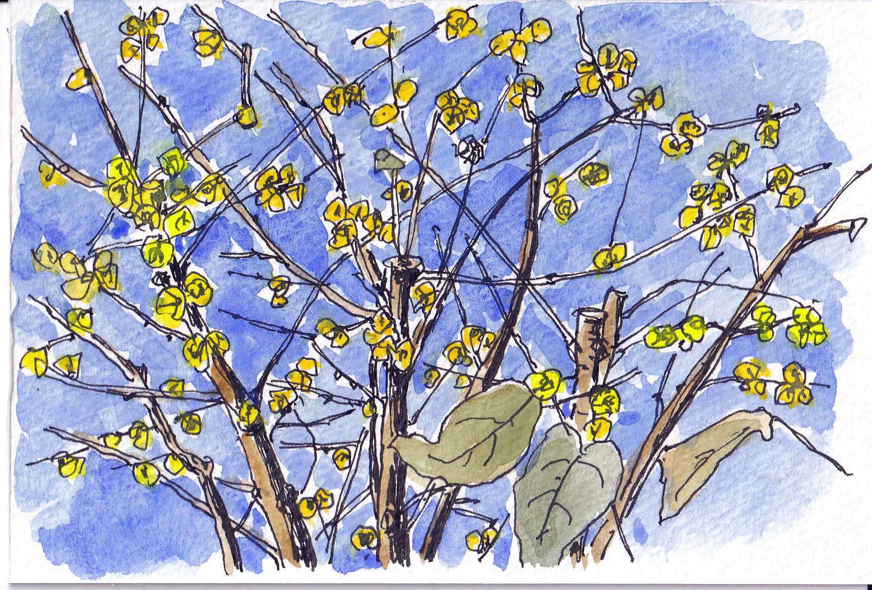 調布市若葉町を散歩していて、青空いっぱいに蝋梅が咲いている光景に出会いました。ここ数日寒い日が続いていましたので、既に咲いているとは思っても居ませんでした(別に狼狽はしませんでしたが)。色はもっと透けるような黄色ですが上手く表現できませんでした。スキャンする際の色の変化もありますが。(2022-1-13載) 今回この画像を見て一つの発見をしました。原画ではどの花も同じように黄色なのですが、スキャンして得られた画像の中で、カドミニウム・イエローで塗った部分はくすんだ黄色、それに対し滅多に使ったことのないオーレオリンを使ったところは透き通った黄色に出ました。この方が今回の実際の色に近いです。教訓として今後もっとオーレオリンを使ってみようと思いました。