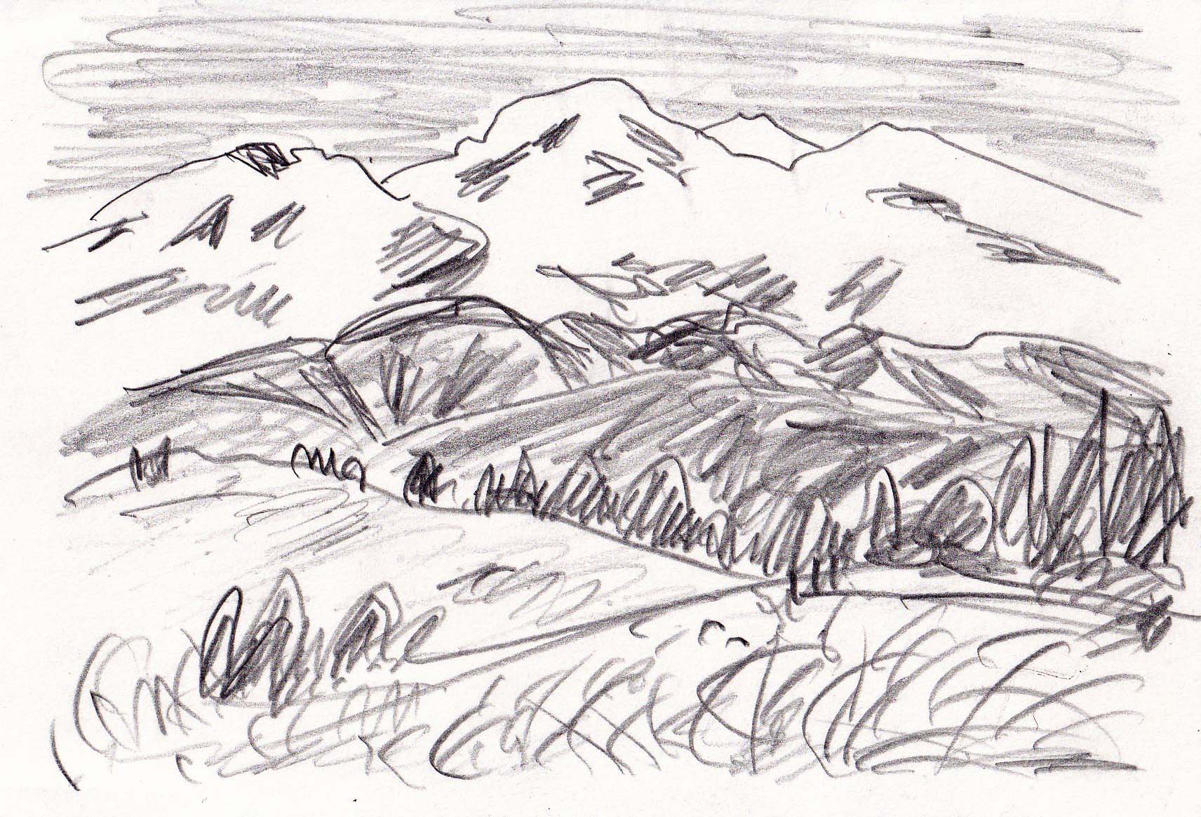 暮れの整理の中で発掘した1枚。私が描いた絵であることは確かだが、どこで描いたか記憶は定かではない。多分 本の写真を見て描き起こしたか あるいは有名画家が描いたスケッチを模写したか? 最近私は水性顔料ペンで描くことが多いが、この当時は鉛筆を使用。これを見て改めて鉛筆の表現力の多彩さを認めざるを得ない。どんよりした曇り空、雪を纏った白い大きな山容、その下は無彩色の麓か前衛の山か? 近景の野原はイエローオーカーか茶褐色だろう。枯草からは風の動きが、モノトーンでも全体に色彩が感じられる。(2022-1-14載)