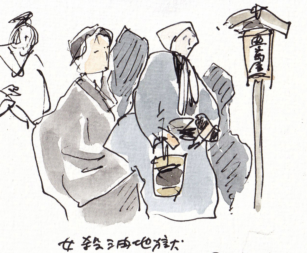 初めて観た人形浄瑠璃。演目は近松の「女殺油地獄」。高校古文の時間でその題目を知って衝撃を受けたものだ。今の週刊誌の見出しは皆こんな感じで、時代をかなり先取りしていたと感心する。左の線描は失敗でウォーミングアップ、無視してください。動作がかなりゆったりしていたので影の人形遣いも入れて瞬間をまずまず切り取られたと思う。(2022-1-17載)