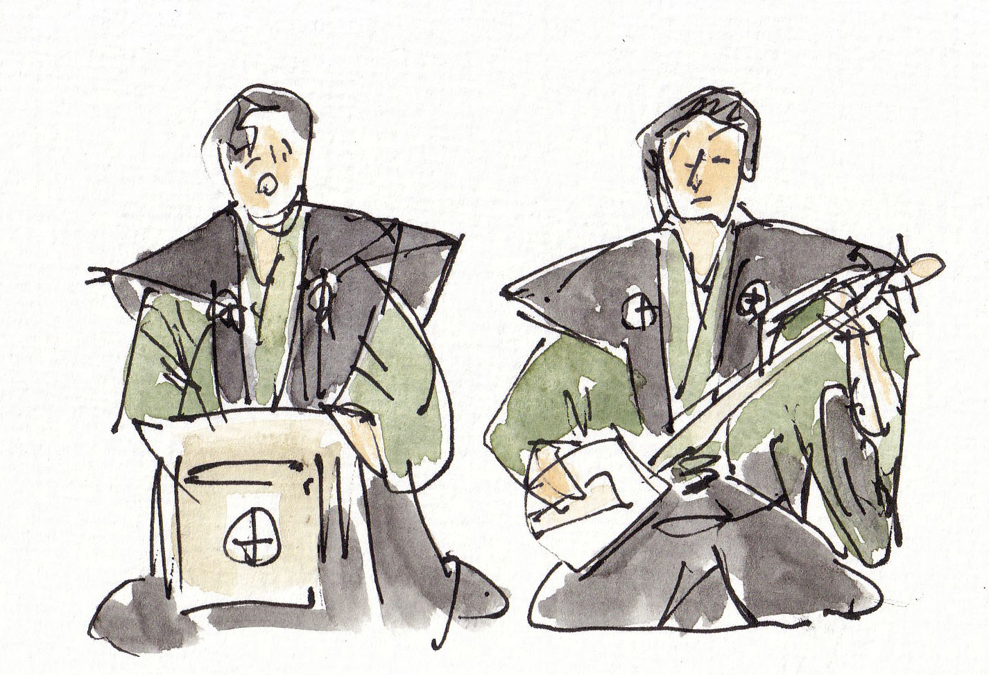 「三味線」の伴奏で「太夫」が物語を語る、それが「浄瑠璃」。太夫は床本を見て浄瑠璃を語るが、楽譜は無いそう。リズムやメロディーのみならず感情を込めて「語る」ことに重きを置き、すべての人物・情景を一人で語り分ける。三味線は幅のある力強い音色で、多種なバチさばきで多彩な表現をし全体を盛り上げる。他の観客の邪魔にならぬよう最後部の席から寸描。(2022-1-17載)