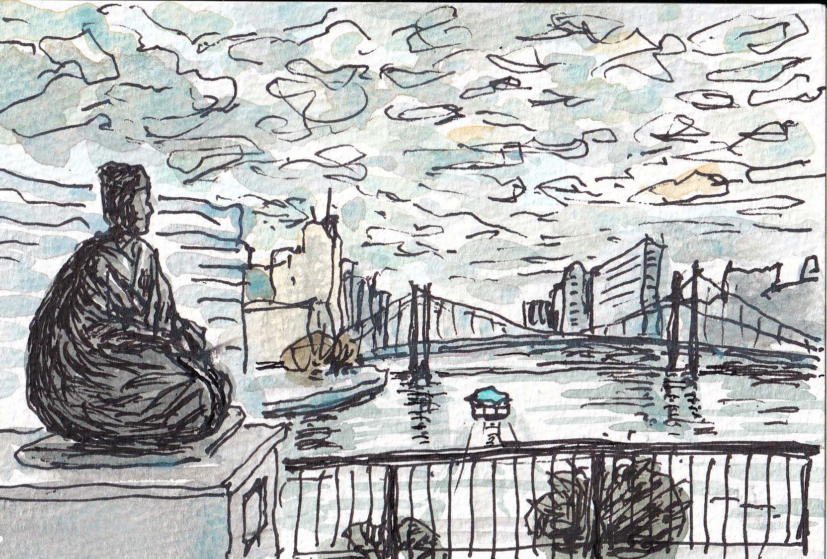深川の芭蕉記念館へ出かけた。俳人や文豪の記念館は文字ばかりで読むものが多く、正直言って私にはあまり面白くなかった。救われるのは目の前を隅田川が滔々と流れていること。記念館すぐ傍の「芭蕉庵史跡 展望公園」の高台に登るとこの像があり、隅田川の流れをしばし楽しむことが出来た。空には叢雲。分かっているのにそれをサインペンで描いて失敗した。(2025-10-6載)