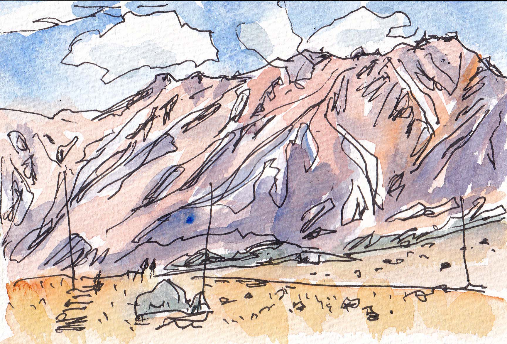 午後3時頃 谷間から霧が湧き上がって来て 一瞬周りの景色が隠れてしまう瞬間がありました。「今夜の星空観察はダメか?」と思いましたが、その1時間後には霧も去り 再び晴れに。山の天気は常に流動的です。光線によって山の姿、特に色彩と山襞の陰影、また私の感動も変わります。本当はもっとたくさんの人影がありましたが省略。(2025-10-22載)
