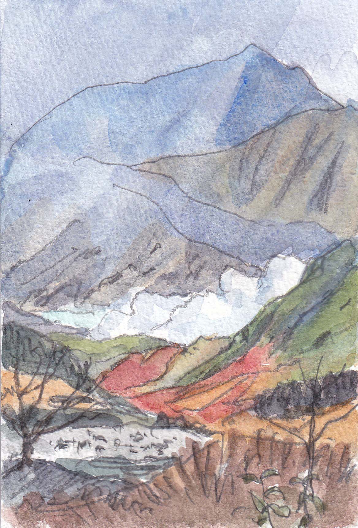 1時間ほどの高原散策案内では「地獄谷温泉」まで往復。もちろんテスリの無い道で、結構 高低差があります。天然石を組んだ階段が続きましたが、踏み面の石は必ずしも水平ではなくバランスをとるのに注意。途中 地獄谷が望めました。かつて来た時は もっと下まで下ることが出来ましたが、今は硫化硫黄の蒸気が多く 上から白い湯気がもうもうと上がり、真っ赤な地肌(水面?)を見るだけ。 ところで途中通過した「みくりが池」、10日ほど前に熊が池を泳いでいることが認められ、周辺に立ち入り禁止令が出た由。ホテルではクマが水面を泳いでいる写真を見ることが出来ました。(2025-10-24載)
