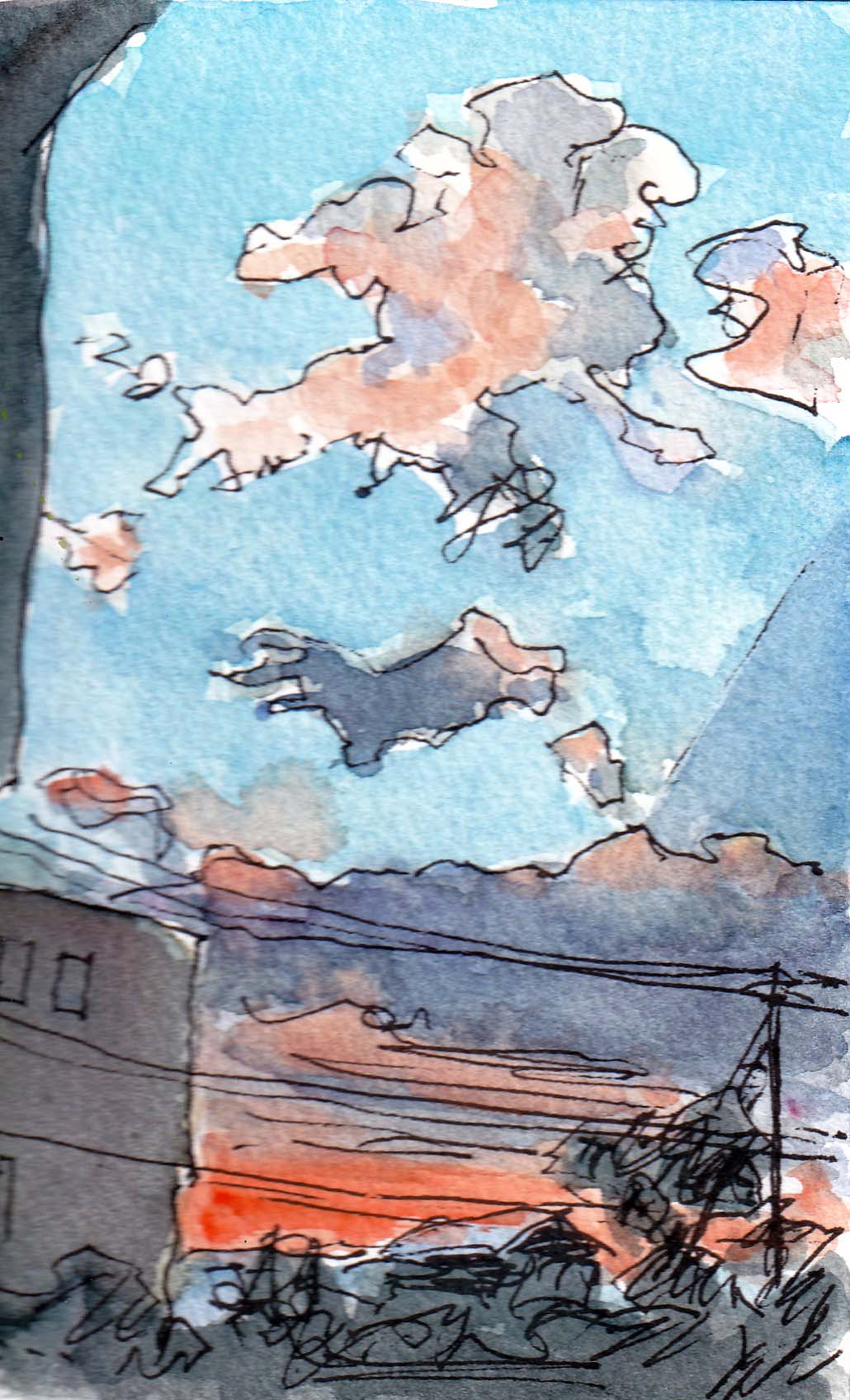 6時35分 テレビ体操を終えた瞬間の東の空。このところスキッとした秋空が望めない中、雲もかかっているが美しい朝空を見ることが出来た。「天孫降臨」の絵に出て来るような光の筋もはっきり。これはサインペンで描くような光景ではないのは分かっているがトライアル。これも勉強。(2025-10-30載)