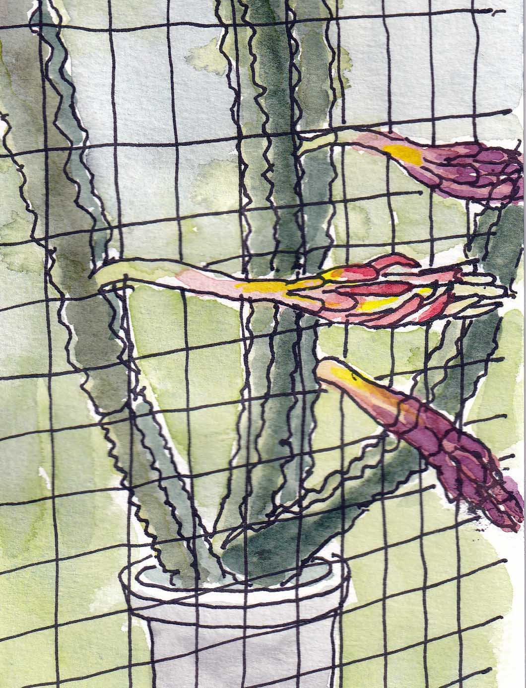 南側隣家のフェンス越しに大きなサボテンの蕾が出ていた。開花したら描こうと思っていたが、油断しているうちに最善の機会を逃してしまった。妻は「あれは月下美人よ」と言っていたが、調べて見ると月下美人もシャボテンの一種だとか。家主に聞いて見ると「柱シャボテン」という名だそう。「奥にもいっぱいありますから差し上げますよ」とのことだが、既に庭一杯 鉢なので固辞。後でネットで見ると3本生えた鉢植えで値段4900円とか。 ところでオカリナ教室で財津和夫の「シャボテンの花」を習った。それまで財津一郎は知っていたが、こんなしっとりした歌を作る財津和夫は全く知らなかった。(2025-10-31載)