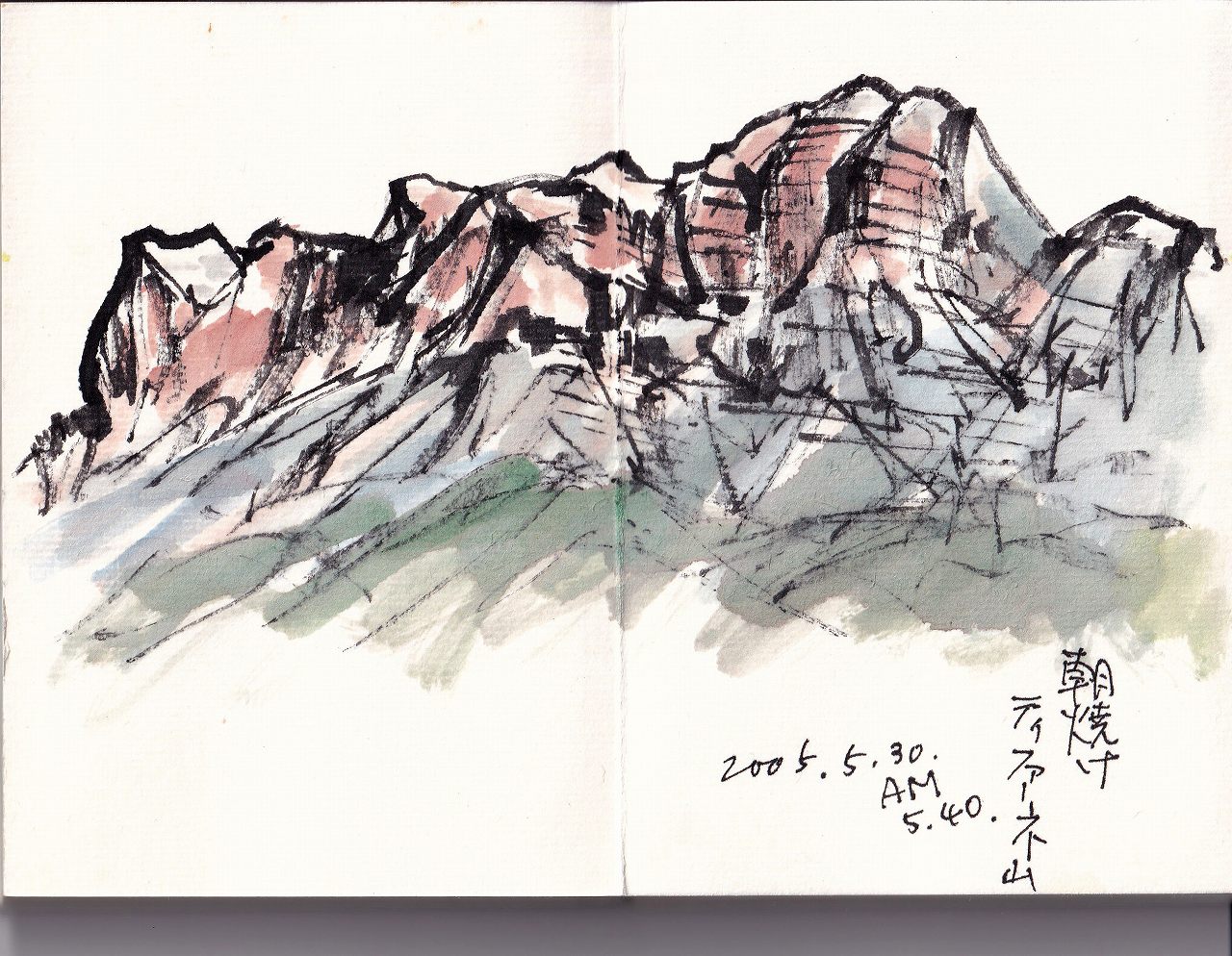 ![]() コルティナダンペッゾで迎えた早朝の景色は、四方とも美しい山に囲まれ、本当に夢を見ているような心地でした。クリスタロ山は規模が大き過ぎて、画面に入り切りませんでした。朝焼けのティファーネ山が描く大きさとしては手頃で、割り箸に墨汁を付けて瞬間芸で捉えました。今見ても線に躊躇いが無く、その時の興奮が描き残せたと思います。(2026-1-28載)