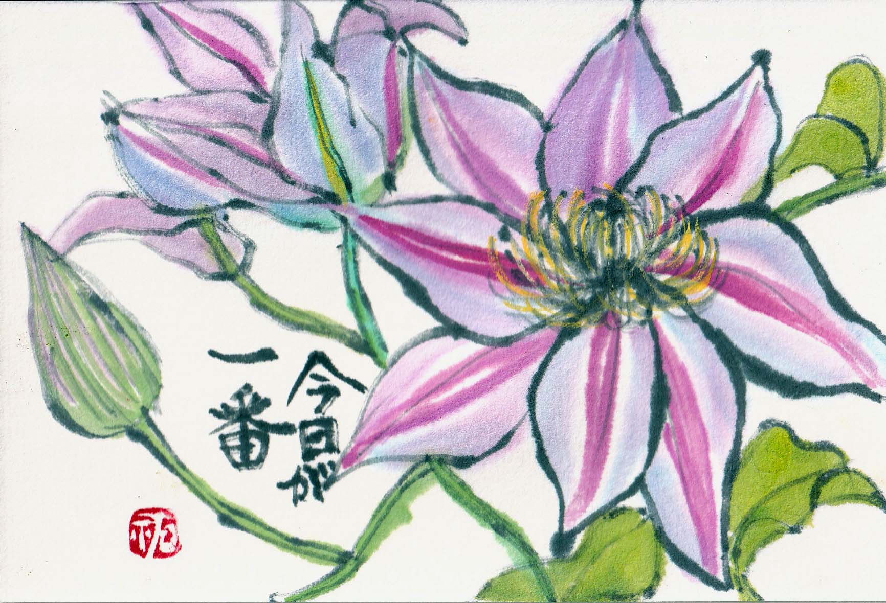 ![]() リヴィングルーム前のヴェランダにおいてあるクレマチスの鉢。ソファに座ると 目の高さにピンクの花を咲かせています。まるで「描いて!描いて!」と訴えているよう。今にも雨は降り出しそう。このタイミングを逃さずに筆を持ちます。(2026-4-23載)